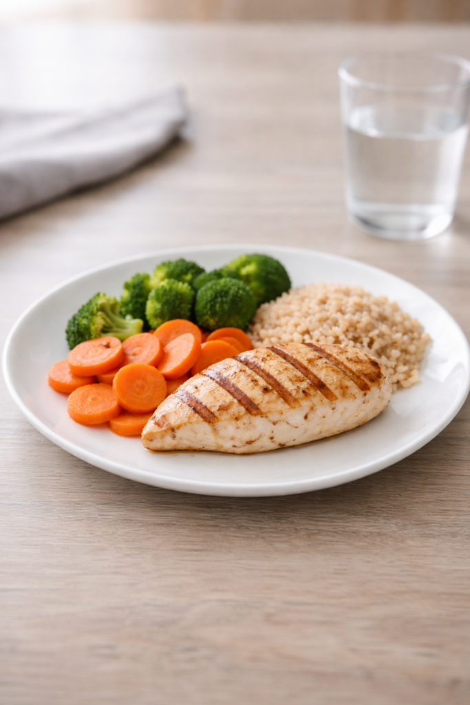 Stick to a basic eating rhythm. Skipping meals often makes hunger worse later. A simple breakfast, lunch, and dinner goes a long way.